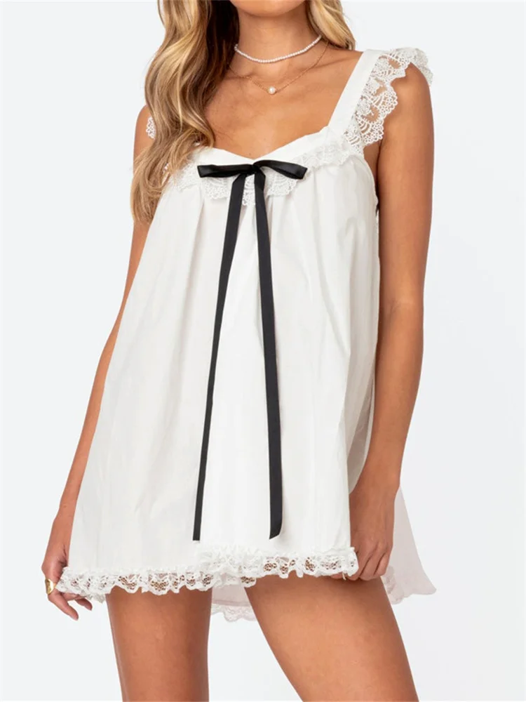 Women Mini Dress Lace Trim Fly Sleeve Bowknot Embellished Short Dress Summer Fashion Casual Dress